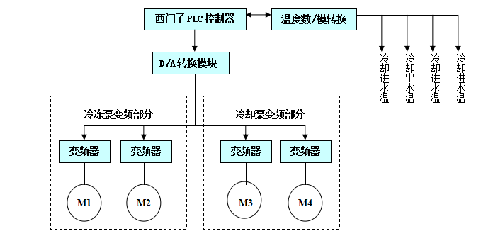中央空調系統中冷凍主機可以根據負載變化隨之加載或減載,冷凍水泵和冷卻水泵卻不能隨負載變化作出相應的調節。這樣,冷凍水、冷卻水系統幾乎長期在大流量、小溫差的狀態下運行,造成了能量的極大浪費。為了解決以上問題,我們可以利用變頻器、松下PLC 、數模轉換模塊、溫度模塊、溫度傳感器等構成的溫差閉環自動調速系統。對冷凍、冷卻水泵、冷卻塔進行改造,以節約電能。